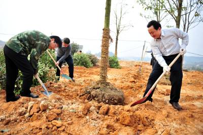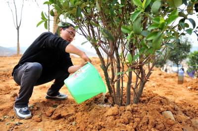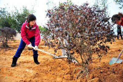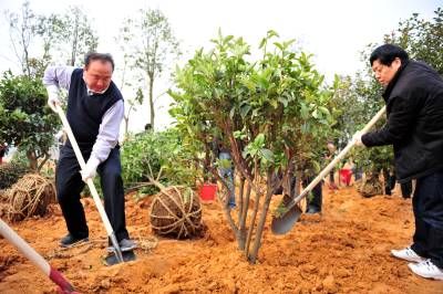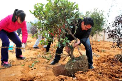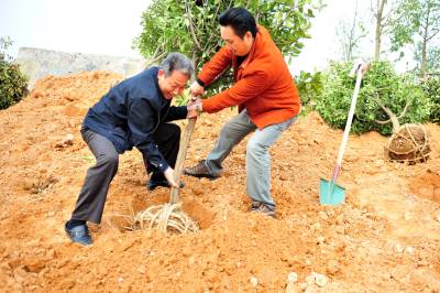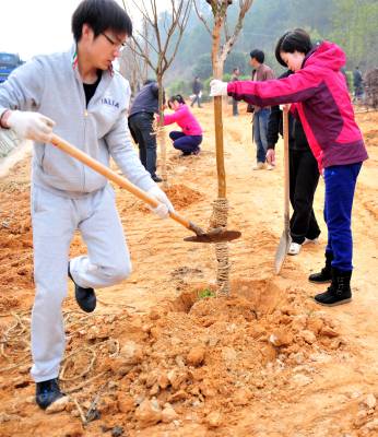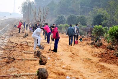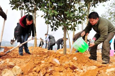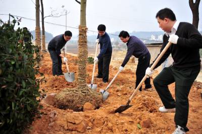 2014年3月10日,宜昌市夷陵区党员干部在鸦鹊岭镇东西泉村绿化点植树造林。连日来,宜昌市创建10个森林乡镇、150个绿色示范乡村的植树造林活动在各地掀起热潮。目前,该市夷陵区已投资1亿元,完成人工造林1万亩,通道绿化73公里,20个村达到绿色示范乡村建设标准。
