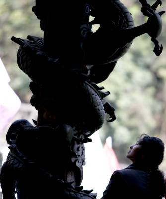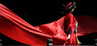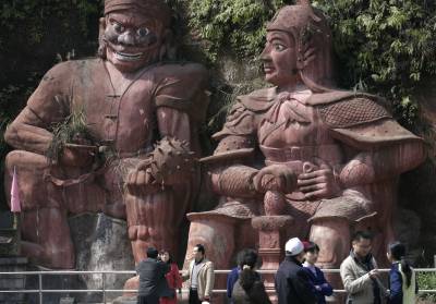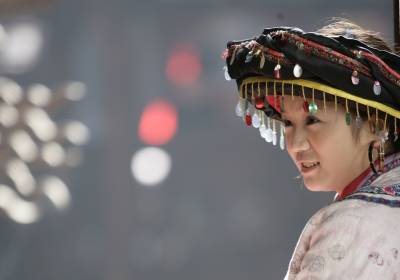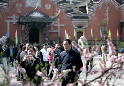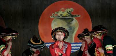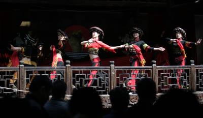 4月4日,几名游客在湖北恩施土司城游玩拍照(恩施土司城演员为游客表演民俗歌舞)。当天,是今年清明小长假的第二天,来自武汉、重庆以及长沙等的3万名游客前来恩施大峡谷、利川腾龙洞等名胜景点度假旅游。