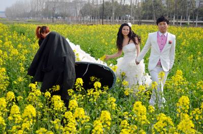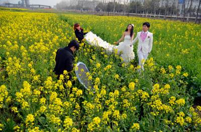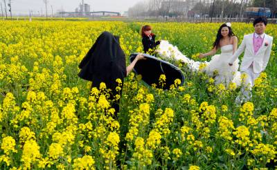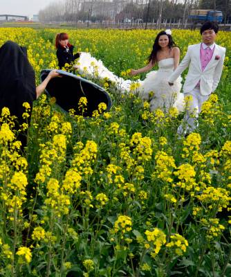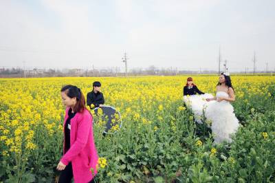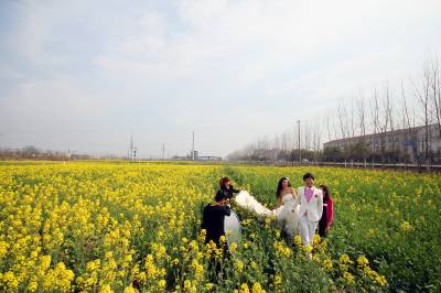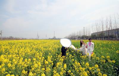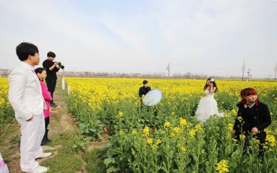 3月14日,阳光明媚,春回大地,云梦县沙河乡辛安村316国道边,油菜花盛开美不胜收。一对年轻男女在金灿灿的油菜花地里拍婚纱照,脸上洋溢着幸福的笑容。( 王云清 摄)