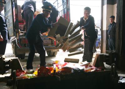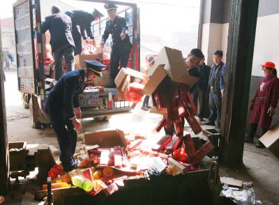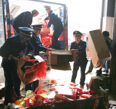 3月15日,湖北省武穴市工商局将近期收缴的问题商品,其中包括伪劣食品2660公斤、假冒日用品2425件、假冒服装1405件、假冒建材1875件和假冒香烟1330条,在现场公开展示后,全部运到该市粮食路垃圾中转站,在市民群众、媒体记者和工商局公平交易分局、烟草局干部的共同见证下,进行压粹处理,然后运往华新环保公司统一处理,避免了对环境的污染。本报视界网冯怡红摄