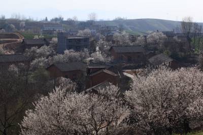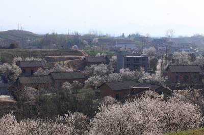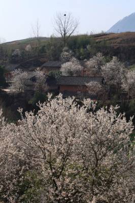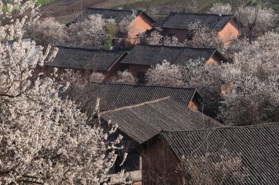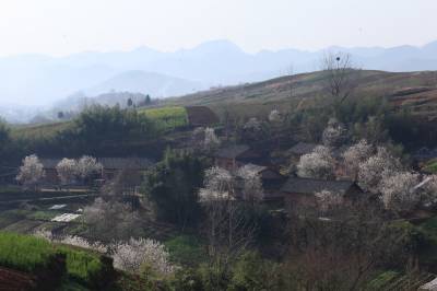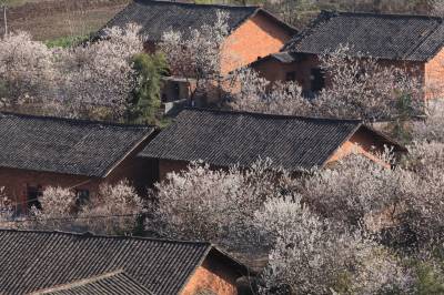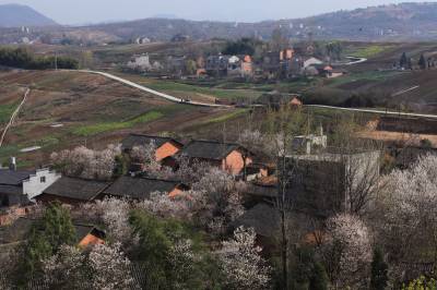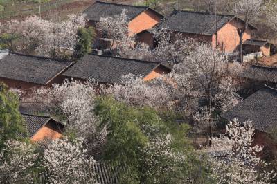 3月16日,竹山县宝丰镇双庙村放眼望去,一株株盛开的樱花环绕着农民新居,顺着山势,或高或低,点缀着山村。