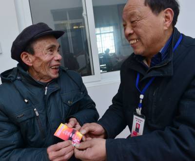3月15日建始县花坪镇花果坪社区70多岁暖空巢老人朱正新从社区党员干部手中接过养老服务联系卡,笑得合不拢嘴。在开展党的群众路线教育实践活动中,该你社区针对不少空巢老人子女不在身边,生活自理十分困难的现状,及时成立互助照料活动中心,印制养老服务联系卡,组织社区党员专门为社区空巢老人服务,一卡在手,若需急救、买米买菜等事情,拨打卡片上结对党员,立马服务上门,目前社区已有40多位空巢老人享受身边党员温馨服务。本报视界网刘波摄