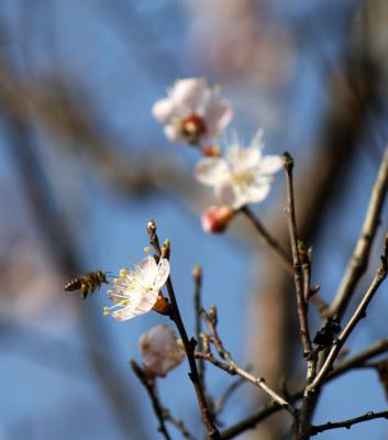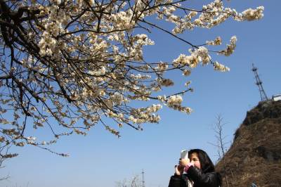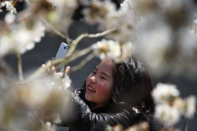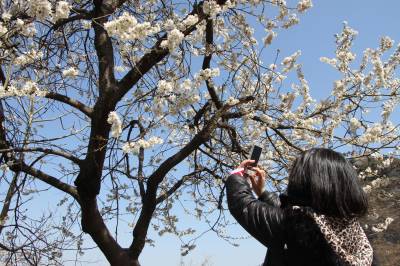 3月16日,一儿童在竹溪县水坪镇洞子沟村拍摄樱桃花。 近几日,竹溪县天气明朗,气温升高,樱桃、杏次第开花,竞相芬芳把春“闹”.