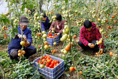 3月17日,农民正在大棚里采摘西红柿。近年来,鄂州市蒲团乡农民利用当地独特的水源和土质等自然条件,发展以冬季大棚有机蔬菜为主体的蔬菜产业,实现“冬种春收”。视界网/方仲华摄