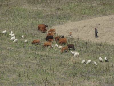 3月16日,在郧县汉江大桥下面裸露的河床上,一位老农在悠闲地牧着牛羊,在不远处裸露的河滩地上一位农民在给自己家种的小麦施农药防虫害,勤劳的农民们在用手扶拖拉机耕种河滩地准备种植早玉米,好一副人与自然和谐的春景图。由于受去年冬旱、今年春旱的共同影响,郧县境内汉江段水位持续走低,大面积裸露的河床上青草刚刚萌芽、肥沃的河滩地一眼望不到边,正是放牧、早种的大好时光。(本报视界网 张文平摄)