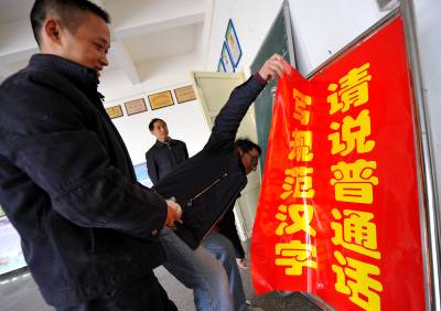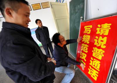 5日,宣恩县青少年活动中心贴出醒目告示:要求进出中心人员说普通话。由于受语言环境影响,生活在恩施山区的土、苗、侗等各族儿女都习惯用方言进行交流,即便是工作交流也不例外。按照要求,该县1万余名干部必须通过再学习,达到《普通话水平测试等级标准》三级乙等以上标准,使这些地区基本普及普通话。(视界网签约摄影师:宋文摄)
