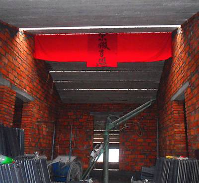 自古以来,民众在建房砌砖、打墙至墙尖子后,要举行上脊檩(指在墙尖上安放檩条 也称上梁)搭红的礼仪。最早的搭红习俗是“脊檩多长红多长”,即时辰一到,瓦匠从主人端来的盘子中,取出与脊檩同长度的红布横搭在脊檩上,主人燃放鞭炮,匠人说四言八句并把脊檩安放到位。后来礼仪更为复杂,有脊檩从地上扯到檐墙、在檐墙上搭红(即将6.6尺红布竖搭在脊檩中间,将9枚铜钱用红线串起,拴上红漆竹筷,吊在红布中央,寓“堆金积银、平安富贵”) 自古以来、两位瓦匠用手将搭红脊檩抬至墙尖等诸多环节,掌脉师说“新修华堂喜洋洋,今日我来把梁上;紫徽高照显四方,百事顺遂大吉昌。”等四言八句,主人燃放鞭炮。安放结束后,主人端出瓜子花生、粑粑糖果供工匠和客人们吃,还要备酒席庆贺。“社教”“文革”中此习俗被禁止,1982年后逐渐恢复。如今,上脊檩(含隔热层水泥板)搭红的习俗简化为在脊檁上横挂一块长6.6尺的红布,布上贴一张竖写的“紫薇高照”的红纸,主亲前来燃放鞭炮祝贺,主人酒席相待。(本报视界网 袁国悦摄)