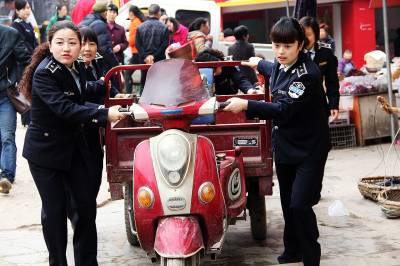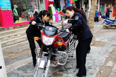 3月19日上午,宣恩县城市管理局新设置的城管女子中队几名女子队员正在对贡水路一带的流动摊贩、机动车辆在人行道上随意乱停乱靠违章行为实行耐心劝导和动手清理整治。。