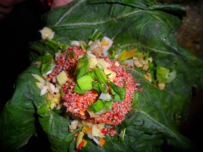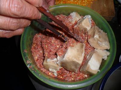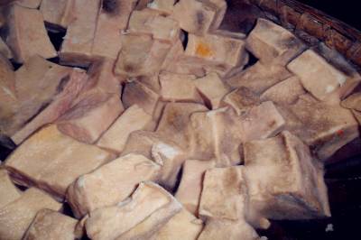 自古至今,民众把豆腐乳称作臭豆腐,也有吃臭豆腐的习俗。臭豆腐的制作方法是在霜降后,将豆腐切成四方形的小方块,放到小筲箕内垫着的干净的枯桐麻叶上,用小锅盖盖住,然后放入柜子里。当豆腐块发酵出现带红灰色的霉绒毛并能闻到臭气味时,将盐、生姜沫、大蒜沫、花椒粉、辣椒面、桔子皮丁等佐料装入小盆中,将豆腐一块一块地夹入佐料中左右前后翻滚,使其六靣都粘上佐料,然后用鲜菜叶包起来放入小罐子中以备食用,“闻到很臭,吃起来很香”的臭豆腐就做成了。一般的臭豆腐需在夏季之前吃完,否则变味。有的农妇在小罐子里倒入适量香油,能保鲜一年多。(本报视界网 袁国悦摄)