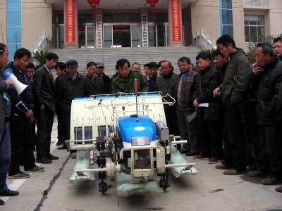 3月20日,黄梅农机手在向农民传授机械插秧技术。当日,该县举办水稻育插秧机械化技术培训班。水稻育插秧机械化技术是水稻高产栽培的重要增产技术之一,眼下又到春耕备播时,该县通过举办培训班、送技术下乡等形式,大力推广水稻机械化育插秧技术,推动水稻生产全程机械化,促进全年粮食稳产增产。(本报视界网 吴志雄 摄)
