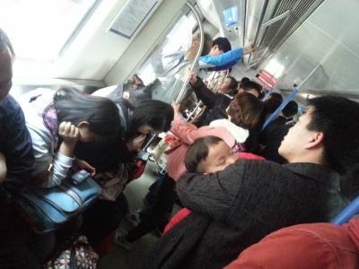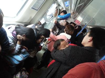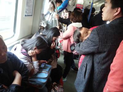 21日下午3点,武汉轨道交通一号线。一男士抱着熟睡的小孩负累地靠在拉杆上,两位年轻的女子只顾低头玩手机,佯装看不见。