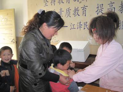 春季是各类传染性疾病的高发期,学校又是人群密集的区域,为保障师生的身体健康,湖北省郧县刘洞镇各学校积极配合镇防疫部门,认真做好在校学生接种春季疫苗的宣传动员工作。截止4月6日,该镇已有1400多学生接种流脑疫苗和麻腮疫苗,接种率达99℅。图为医务人员在刘洞镇九年一贯制学校为为幼儿园孩子接种疫苗。(湖北省郧县刘洞镇九年一贯制学校高超邮编442525)