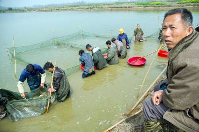 “我愁得都不想说话了。”3月22日,云梦县沙河乡雷桥村的几个鱼塘都在分鱼苗,村民彭道怀(右一)面对笔者的提问如是说。彭大爷今年60岁,养了10多年鱼从来没有碰见这样的现象。他说去年鱼价便宜,导致一部分渔民囤积成鱼,影响今年的鱼苗放养;还有一部分渔民见养鱼效益不好,改种莲藕,往年每斤鱼苗7.5元抢着要,今年每斤2元却无人问津。据悉,该村有1万多亩鱼塘,年产近万斤鱼,今年全村约有60万斤鱼苗滞销,渔民都愁得不得了。 (本报视界网 王云清 摄)