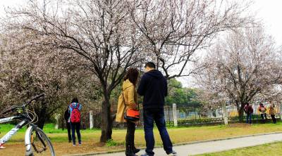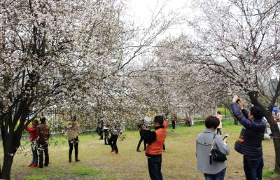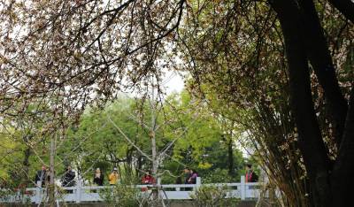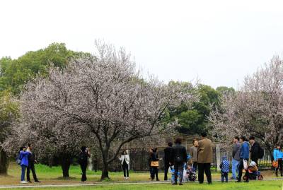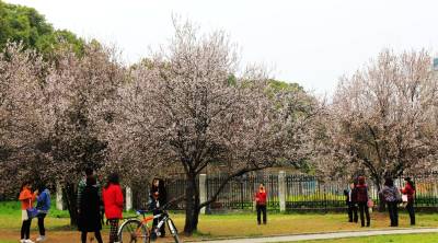 烂漫的樱花,灿灿若去霞云,层层相叠,朵朵相系,一团团一簇簇你拥我挤,相亲相爱地簇拥在枝头,有羞涩地打着朵儿,有静悄悄地绽放,融入春风里,那树枝摇曳,连片花枝如波浪上下起伏,粉嫩花瓣如白雪纷纷飘洒,让人充分领略着春的神韵,令人心驰神荡,遐思翩翩。游人们三五成群前来踏青赏樱。有轻抚摸花枝,清香扑;有树下摄影留念,绽放笑容;人们在这里流连往返,乐此不疲。
