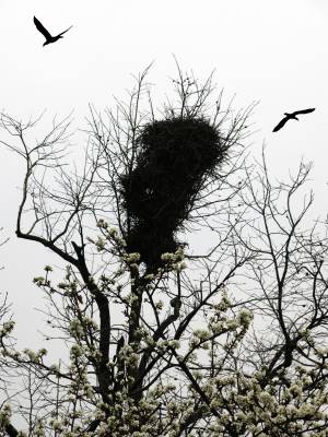 3月24日,两只鸟儿在竹山县官渡镇新街村刘启富家房前的一棵建有鸟巢的柿树上空盘旋。