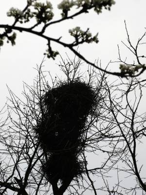 据刘启富介绍,这棵柿树有十多年的树龄。三年前,一对乌鸦开始在这里搭巢建窝,到了第二、第三年,都有乌鸦建巢,今年有好多鸟儿在这棵树的上空盘旋,好像看中了这棵树,已垒起三个窝了,如果再建就是“四层楼”的鸟巢了。