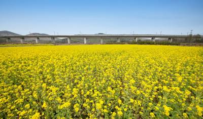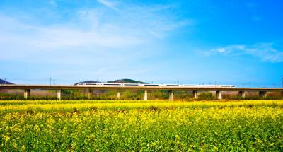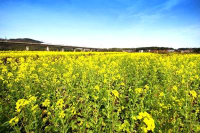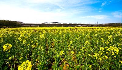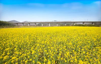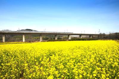 3月末,赤壁市中伙村油菜花盛开。飞驰的高铁仿佛在花海中穿梭!