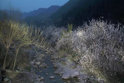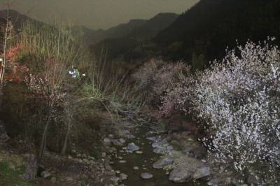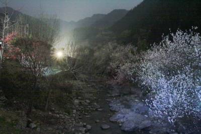 宜昌姜家庙村位于夷陵区,它四面环山,清流环绕,原生态的地貌村落给人很好的视觉享受,著名的下牢溪就从村中蜿蜒穿过,时值春季,大片的樱桃花、油菜花在村中交相辉映,白天这里游人如织,月夜下,姜家庙村又显现出独特的魅力。 (摄影:张博 丁朴 15872456099)