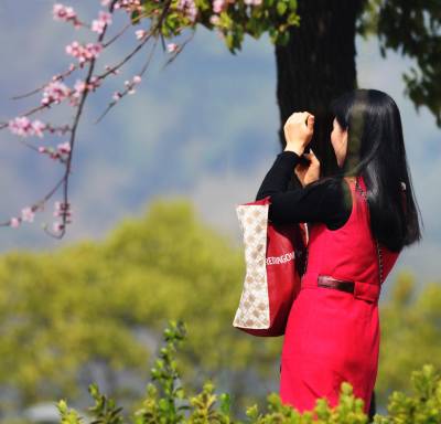 一位女士用手机拍花。