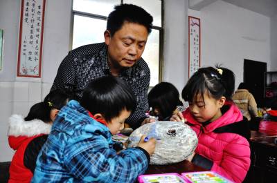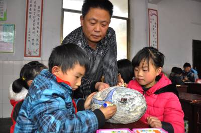 3月25日,在恩施市红土乡中心小学三(3)班教室里,几名学生正在老师的指导下创作自己的卵石画作业。