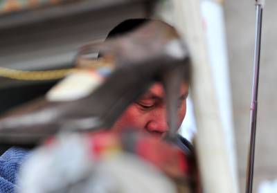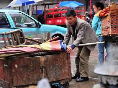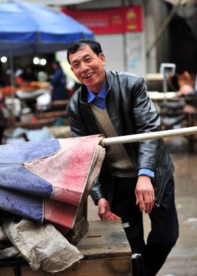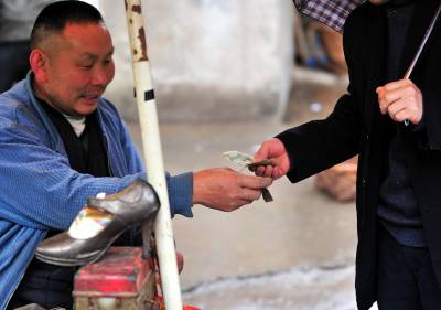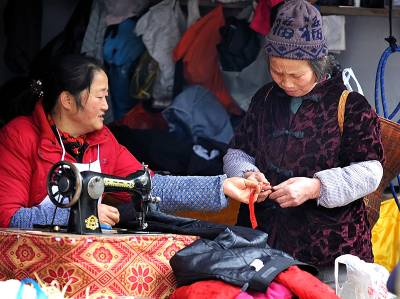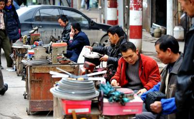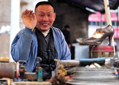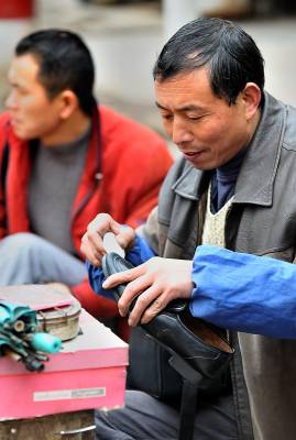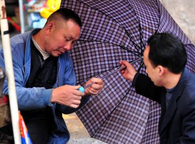 7日,尽管天空下着雨,但在宣恩县城从事修补业的工人师傅7点多钟便准时到街头撑起伞,开始等待配钥匙、补壶、修雨伞、鞋子的人”上门”。如今的人们生活富裕了,但生活中仍然有许多地方离不开修修补补。在修补摊上花上一两元钱,坏了的伞可以再打,鞋可以再穿,壶可以再用……修补师傅们一方面是为了生计等待顾客,而在不知不觉中,他们也在建设节约社会贡献着他们的力量。一位从事了20多年修补业的老师傅说:”现在城市里的人们、特别是年轻人,愿意修修补补过日子的越来越少了!如果人们再节约一点,我们的生意也就好得多。”(视界网签约摄影师:宋文摄)