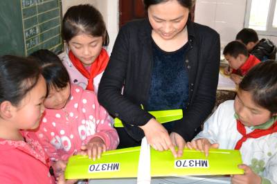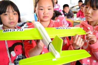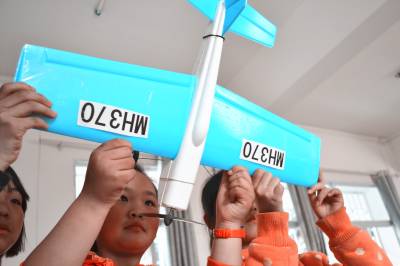 当日,湖北省郧县柳陂镇中心小学四年级学生通过搜看“马航飞机MH370‘终结’于南印度洋”视频和网页,利用“废旧物”制作出“马航飞机MH370”的形象,以表达心中之痛。同时,还让学生了解航空知识,感受水陆空各种交通安全的同等重要性,多一份安全,少一分痛心。