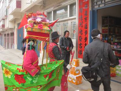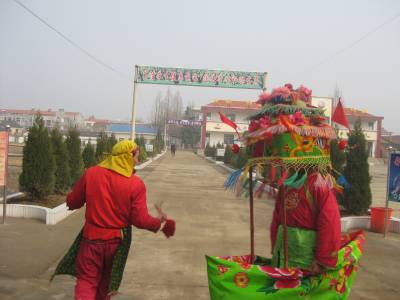 制作旱船是用细竹竿绑成船型的架子,旱船的大小不等,随人意而定。船形骨架的中间用竹竿绑个“井"字架,“井口”既是船舱的部位,也是表演者的部位,顺着船舱的四角竖4根竹竿,为船舱的4个柱子,然后在上面绑制船舱的顶部。船舱的顶有平顶的,三角形顶的,较复杂的歇山顶式的瓦棱出水的古建筑造型。船的 骨架绑好后,用彩绸布围好各个部位。船顶用红和黄的彩绸布裹好,船板用土黄色布绷面,船帮周围用绿色彩绸布围起,船舱内用一根红布条拴在仓的两边沿,演出时,表演者将红布条架在肩膀上,撑起旱船,两手握住 船仓的两边,表演时摆动旱船行进。