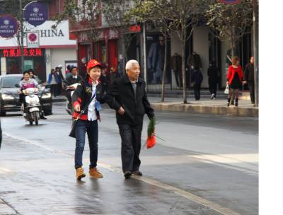 3月26日,“文明劝导员”(戴红帽者)在竹溪县街头劝导市民文明过马路。当日,竹溪县“文明劝导”志愿服务活动正式启动。竹溪县为大力培育文明风尚,提升市民文明素质和文明形象,在城区主要路段开展以“讲文明、树新风、促和谐、促创文明县城”为主题的“文明劝导”志愿服务活动。“文明劝导”志愿者由县直机关青年干部组成的“文明劝导员”和城区中小学生组成的“文明使者”组成,“文明劝导员”每周三上午8点至9点30分开展志愿劝导活动,“文明使者”每天上、放学时间开展志愿劝导活动。“文明劝导”志愿者重点对乱扔乱倒垃圾、乱贴乱画、乱穿马路、损坏公物、践踏绿地等不文明行为,车辆乱停乱放、占道经营、施工占道等不文明现象,沿街经营户不讲卫生、不讲秩序的行为进行劝导。