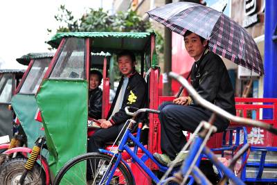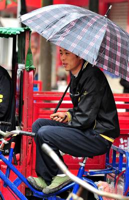 7日早上7点多钟,宣恩县城区靠跑三轮摩托、人力三轮车生活的民工们,或躲在三轮车里、或撑着雨伞在指定位置冒雨等待顾客”上门”。尽管他们每天就百十来块的收入,但因为可以留在家乡、因为少了外出务工的千里奔袭,他们的幸福写在脸上。(视界网签约摄影师:宋文摄)