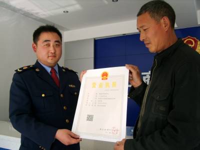 3月26日,保康县黄堡镇明林茶场负责人在黄堡工商所领到了黄堡镇首张新版营业执照,这位负责人激动地说:“领到黄堡镇的第一张新版营业执照,我这心里真高兴!