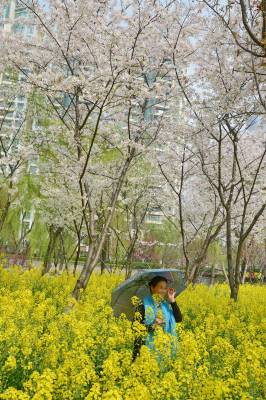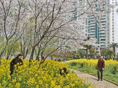3月26日,武汉市春光明媚,阳光灿烂,回春吐翠。当日下午,江汉区汉口西北湖绿化广场湖边绿上的白绿两色樱花盛开争艳,油菜花开金光灿灿,芳香扑鼻,吸引了慕名而来踏青赏花观景的居民群众。他们恍如走进了寸土如金的世外桃源里的都市田园风光,随处可见美不胜收的各色樱花,随处可闻油菜花香。