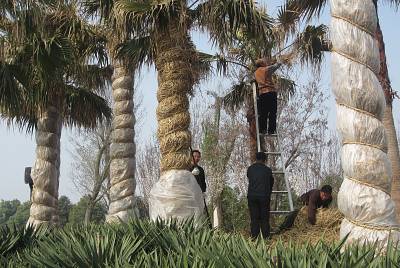 近日天气渐暖,荆门市生态运动公园工作人员正在为老人葵脱“冬装”。由于去年冬天气温寒冷,为防止老人葵树体发生冻害、脱落等现象,工作人员特意为园区老人葵包裹上一层厚薄膜。 本报视界网 张彩云 摄