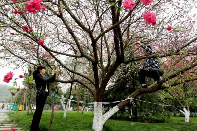 3月28日,在宜昌三峡大学内桃花开放,人们能享受这美景,但不要这样,多不美啊!