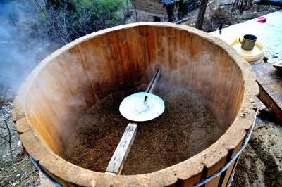 湖北郧县乡村农民自古就有土法烤酒的传统习俗。每年进入腊月,家家户户都要在家门口烤制土酒,山村处处弥漫着浓浓的酒香。农家土酒,口味纯正,清香四溢,回味绵长倍受城乡居民的青睐。所谓农家烤酒,即用火将玉米、拐枣、柿子等蒸热发酵后进行蒸馏而成酒的民间技艺。烤酒器具有大、小铁锅各一口,一作底锅,一作天锅,木制酒甑一只,引酒管一根,贮酒器一个。其过程是将玉米、拐枣、柿子等蒸热,拌上小麦酒曲埋入地窖发酵一个半月,然后放进木制酒甑,加火使发酵的玉米、拐枣、柿子等形成酒蒸气,酒蒸气通过天锅冷却进入引酒管,遇冷形成酒液。