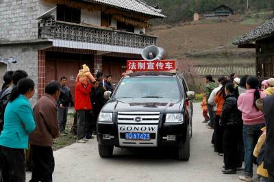2010年4月2日,恩施市红土乡的法制流动广播在该乡龙角坝村覃家大院,为院子里的群众送去”计划生育法””道路交通安全法”和”森林防火条例”。