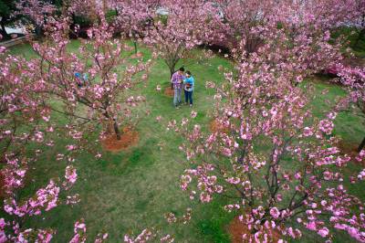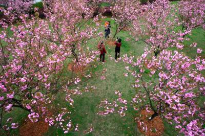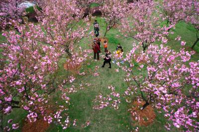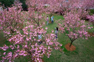 3月30日,咸宁市的市民们在当地人民广场赏花游玩。近日,咸宁市气温回升天气晴好,各处公园百花竞相盛开,市民们纷纷利用周末闲暇之时走到室外踏青赏花。