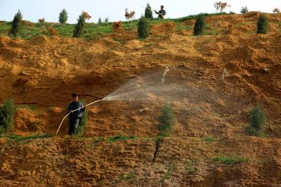 3月31日,湖北省十堰市工业新区后山一片繁忙,绿化工人们正在给喷客土播种草籽的地方浇水。入春以来,湖北省十堰市张湾区在打造车城后花园和美丽乡村建设中,投资1.5亿元,绿化工业园区和公路两边裸露山体3800亩,植树134万株。