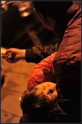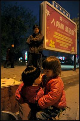 在这时,一两个身穿红衣服的小孩怯生生的凑了过来,瞄上了我,我举起相机对准她们,羞怯躲闪之后,便放开了童性,任由我按下无数次的快门。真不容易,两岁多一点,随着父母漂泊于远离家园的异乡,居无定所,颠沛流离。在这灯火辉煌、喧嚣尘上的城市的夜晚,越发将他们孤单的童年映衬得格外的刺眼,在这里,有父母的慈爱,亲友的呵护,却没有了生养她的故土润泽,对于我们来说,那将会是一种什么样的童年啊。
