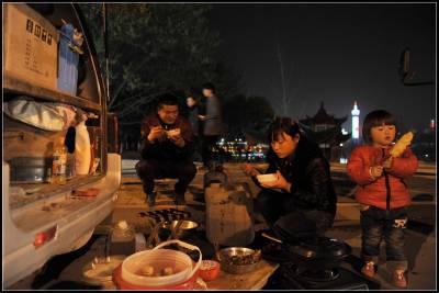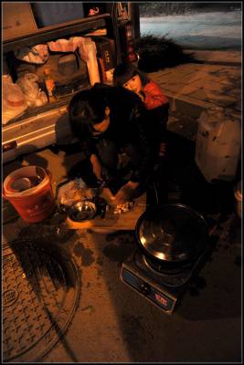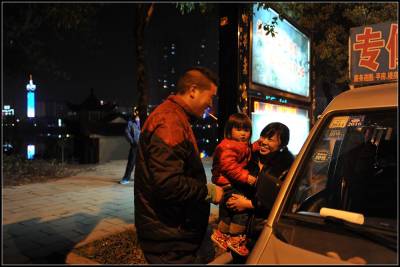 在城郊街道的一旁,一排挂着安徽牌照的面包车静静的停在马路边上,妇女们开火做饭,男人们抽烟聊天,有的甚至在把玩着智能手机。一位慕容姓的小伙子指着“蒋介石之孙蒋孝严回来祭祖了”的一条新闻给我看。也许,这是他们业余时间唯一的、最有效的一种消遣方式吧。