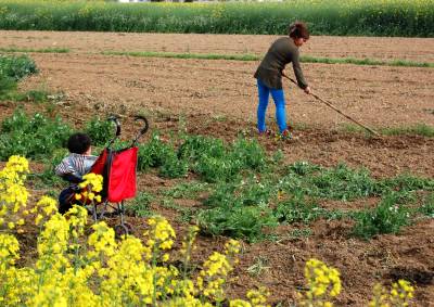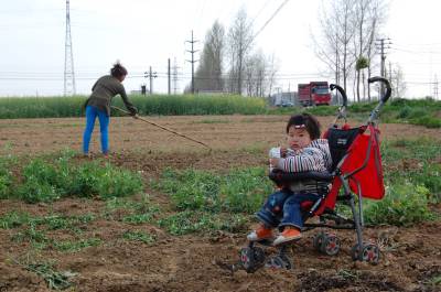 2014年3月31日,云梦农村一名村妇带着小孩在田间劳动。