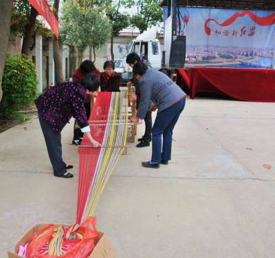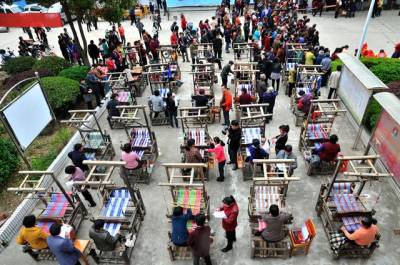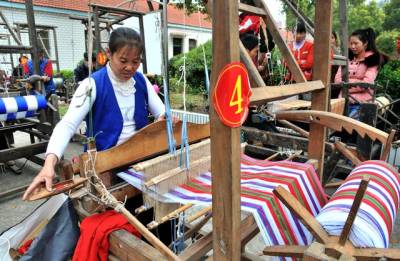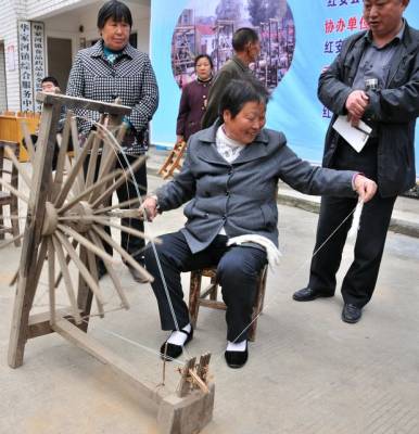 红安县将军红土布织锦农民专业合作社 举办“土韵”大布织锦技能大赛 红安大布是当地民间土法纺织的,正成为当地经济文化和时尚大潮的引领者,不仅被列入湖北省级非物质文化遗产名录,还亮相上海世博会,“土韵”商标正唱响红安大布。3月31号,红安县将军红土布织锦农民专业合作社等单位在华家河镇举行“土韵”大布织锦技能大赛。在比赛现场,20位织女一字排开,在“吱吱呀呀”的织布声中,脚踩纺车,手抛织布棉纱,娴熟地织出了五彩斑谰的大布。图为该县大布织锦技能大赛现场。