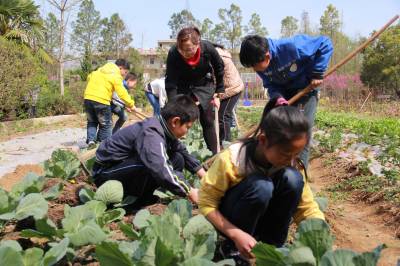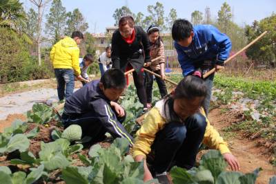 4月1日,陈惠丽老师和学生一起在给包菜松土、除草——安陆市王义贞镇星火小学利用村里划拨的4亩学农基地每年种植时令蔬菜3万多公斤。学农基地给师生提供了时令的蔬菜,还培养了学生热爱劳动的习惯,让学生学到了许多书本中学不到的知识。(本报视界网 王代金 摄)