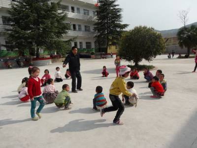 4月1日下午,在湖北省郧县刘洞镇姚沟小学的操场上,“爷爷教师”张金栓正在指导他的一群“孙子辈”学生玩丢手绢游戏。孩子们玩得是那样尽兴,操场上飘荡着一串串幸福的笑声。说起“爷爷教师”这个称谓,还要从张金栓老师的从教生涯算起。1954年出生在郧县刘洞镇江峪村的张金栓老师,到今年8月份就要退休了,算起来教书整整37年了,他教的最大一个学生的孙子都上小学二年级,他的很多学生现在在家都当上爷爷了,算起来他也称得上是教过三代人的“爷爷教师”了。1977年张金栓老师在自己家乡的江峪小学当上了一名民办教师,一干就是37年。在这37年的教书生涯中,张金栓老师的足迹踏遍了郧县刘洞镇4个学区小学、9个教学点。2013年秋季,郧县所有乡镇都成立了中心幼儿园,在很大程度上解决了农村学前儿童入园难的问题。但是在刘洞镇姚沟小学所在的姚沟村,由于该村离镇上有十几里路,这里的农村学前儿童的入园难还不能得到很好地解决。在当地村民的强烈要求下,姚沟小学专门成立了一个“苗苗班”来接收当地26名学前教育儿童就近入学。为了办好这个“苗苗班”,原本师资力量就非常紧张的姚沟学区将在白马村教学点工作,还有一年就要退休的张金栓老师抽调到姚沟小学,当上了“苗苗班”的班主任兼代课教师。但对于张金栓老师来说离家就更不方便了,现在回家比原来所在的教学点要多走十几里路,再加上老伴进城接送孙子上学,每天张老师要在家和学校之间来回奔波,但是张金栓老师从来没有向组织提出任何要求,他总是笑着面对现在的学前教育工作。“整天和这些娃娃们在一起,我虽然很累,但是我过的很充实,很幸福,很年轻。”张金栓老师时常用这样一句话来勉励自己站好这最好一班岗,育好这最后一批新人。如今,在郧县学前教育岗位上有很多象张金栓一样的“爷爷教师”,快要到退休年龄了,从“义务教育一线”退了下来,又转战在“学前教育前线”,在学前教育师资力量薄弱的情况下,是他们用辛勤的劳动付出撑起了郧县农村学前教育一片片蓝天。(本报视界网 张文平 摄)