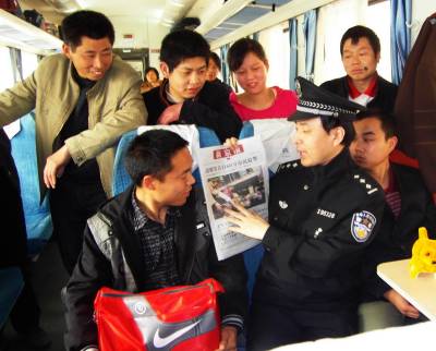 【通讯员罗超】4月5日,中国二十四节气中的清明,也是民间祭祀缅怀逝者的日子。襄樊铁路乘警在做好治安防范的同时,与旅客一起畅谈清明文化,追忆公安战线民警光荣献身的丰功伟绩。大家怀着崇敬的心情,秉承英雄的遗志,弘扬正气,为构建和谐社会献出自己的绵薄之力。图为进京列车乘警与旅客一起读报赞英雄。