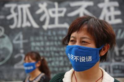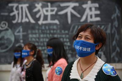 4月2日,襄阳展颜特殊教育学校老师、湖北文理学院的志愿者戴上印有“今天不说话”的口罩体验自闭症儿童不会说话的感受,号召大家关注自闭症群体。