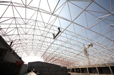 4月8日,在荆门生态运动公园主体育场南侧,施工人员正为游泳馆网架刷白色的防火油漆。该游泳馆规划建筑面积7560平方米,长88米、宽58米、高18米,有一个8泳道的标准比赛池和一个6泳道的训练池。它预计6月30日完工,将用于省十三动会游泳项目的比赛。视界网签约摄影师朱运兵摄