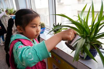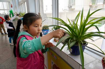 4月3日,云梦县实验幼儿园大班的小朋友正在给她负责的吊兰浇水。今年,该幼儿园在全校开展“每人养一盆花”的活动。每位幼儿都从家里带一盆花,花盆上写上花的名称和小朋友的姓名,每位幼儿负责给自己的花浇水,搬出去晒太阳,旨在培养幼儿从完成任务中增强责任心。 王云清 刘太平 摄