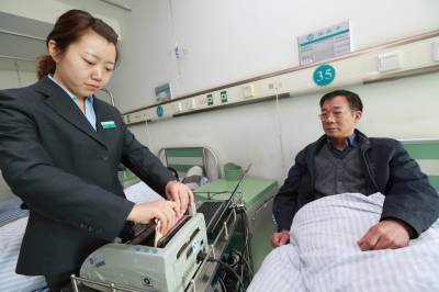 日前,襄阳市中医医院率先在全市首推“床边结算”的新举措,让患者体会到更加便捷的医疗服务。据悉,该院把出院结算转变成可移动的服务窗口,主动上门为行动不方便的患者等提供服务,即将出院的患者可选择付现金、刷医保卡、银行卡、信用卡等方式进行支付,让患者不出病房就能享受到高效、快捷的出院结算。图为该院工作人员为患者床边结算。李丽 文 邵本刚摄