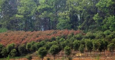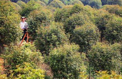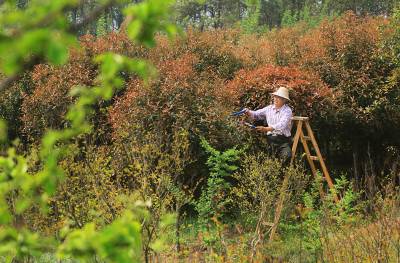 4月8日,家住东宝区仙居乡革新村二组的龚家德正为自家种植多年的红叶石楠修剪枝型。仙居地区多为缺水少田的山地,原为村主任的他退休后,发现当地气候适合桂树生长,且树形好看颇受外商青睐,于是带头将自家近50亩地改种桂树,尝到甜头的他发动全村因地制宜发展苗木种植,并扩大种植红叶石楠、银杏等树种,成立苗木种植专业合作社,发展社员106户,近几年行情不错,每家都有近万元收入,如今全村种植上百亩桂树,被外界称作“桂花村”。本报视界网 张彩云 摄