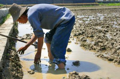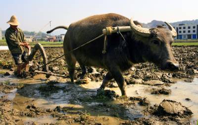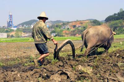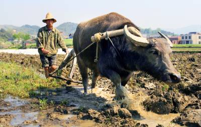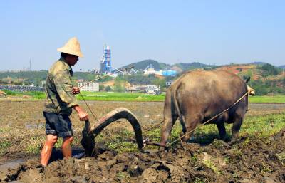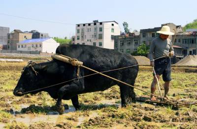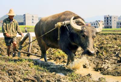 4月9日,清明节后,竹溪县一遍犁耙耖子闹春耕的繁忙景象。 竹溪境内自去年初至今没涨过一次满河水,时至目前正是农田备耕下种黄金时节,竹溪境内仍无雨缓解旱情,全县各级政府极积筹资购置抽水器材,抽调防旱保农业生产的库、塘储水灌溉农田,确保今年全县水稻农业生产丰收。4月9日,竹溪县水坪镇黄龙村村民郭承庆正在挥鞭使牛犁秧田(本报视界网温大树摄)